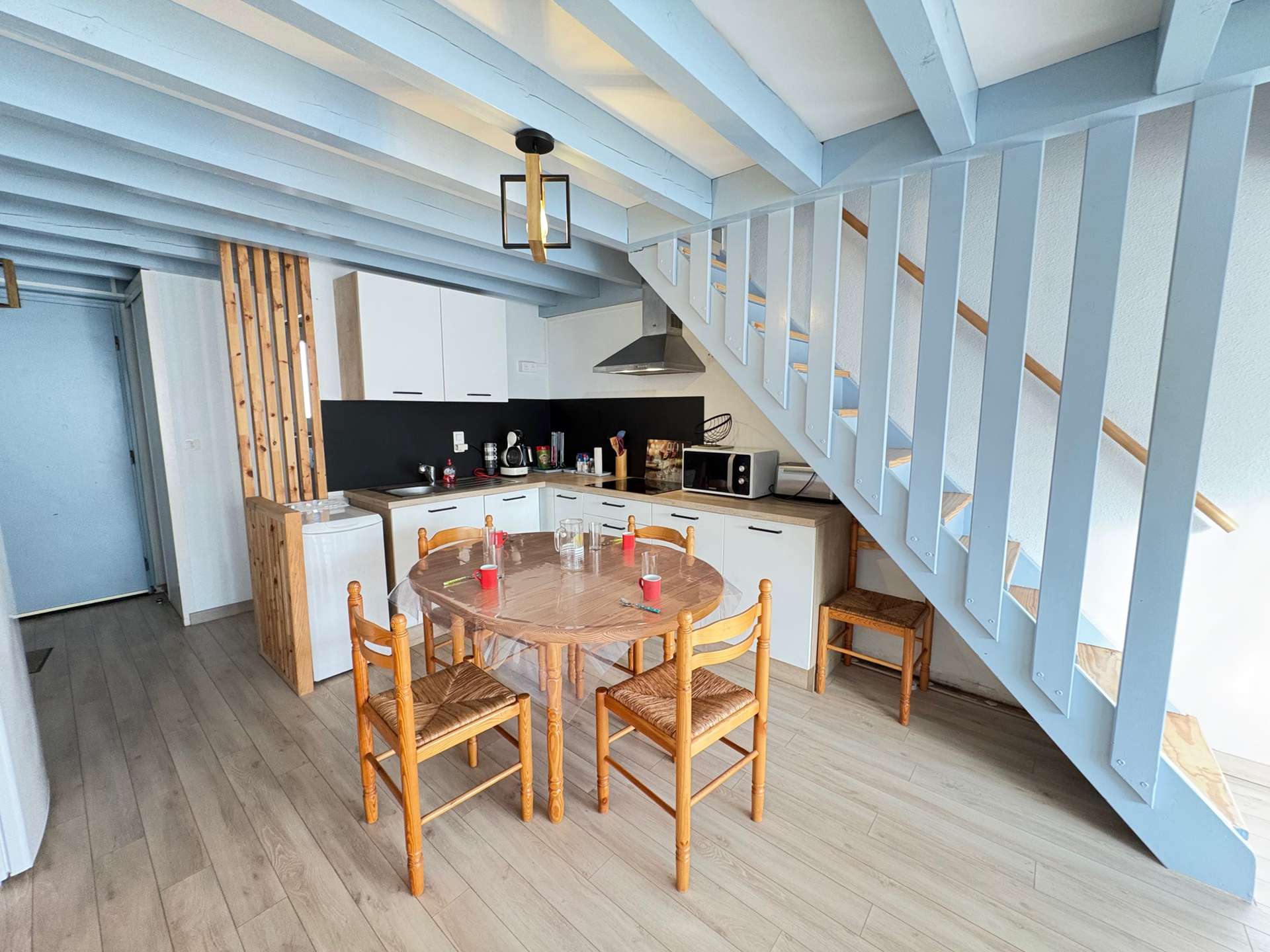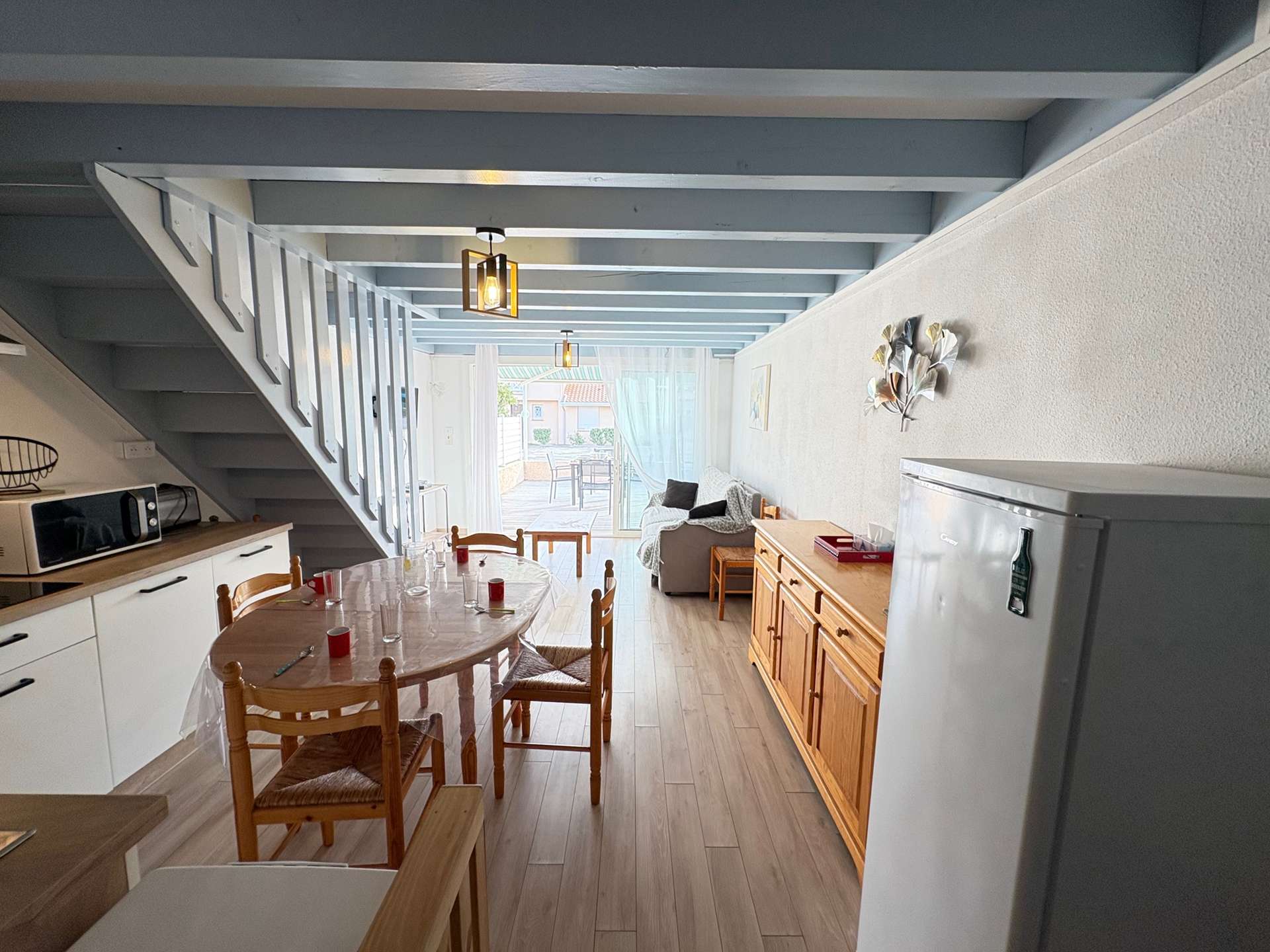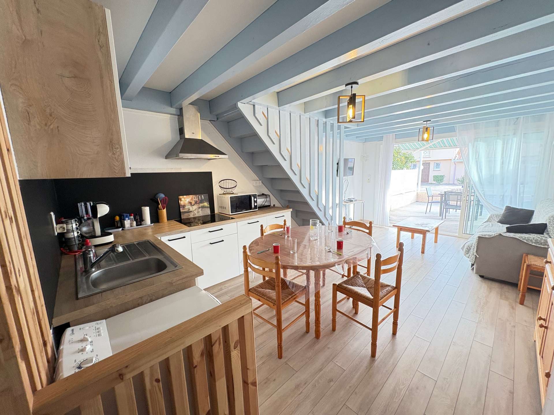 Elle se compose d’une pièce à vivre une cuisine entièrement équipée comprenant un réfrigérateur/congélateur, machine à café KRUPS, bouilloire… un coin salle à manger avec une table et une partie salon.