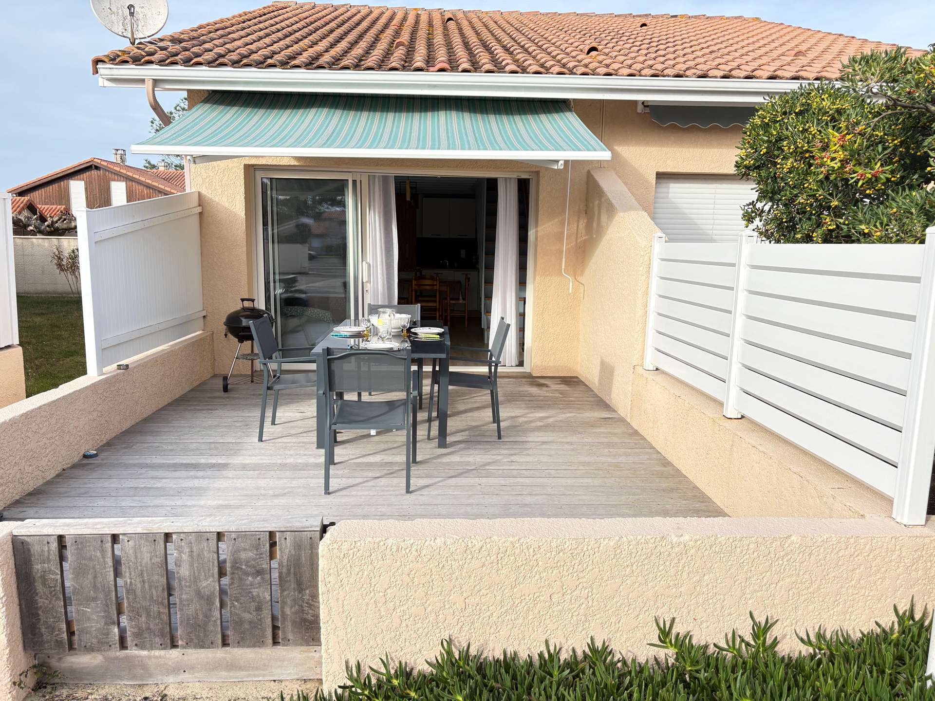Terrasse privative exposée plein Sud de 20m2 avec mobilier de jardin et BBC.